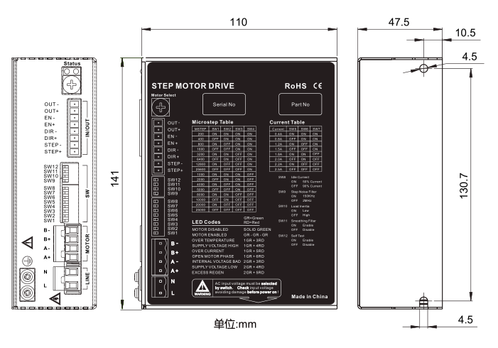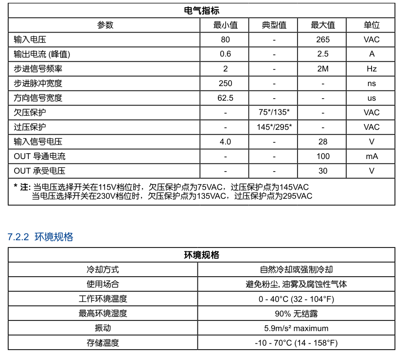 l 運行電流 - 峰值設置,撥碼開關可選,8種電流設置:0.6A, 0.8A, 1.0A, 1.2A, 1.6A,1.8A, 2.0A, 2.5A.