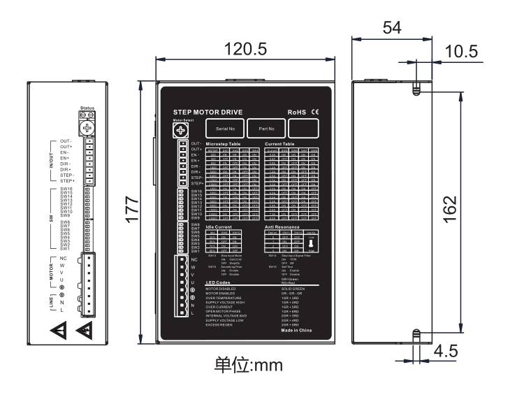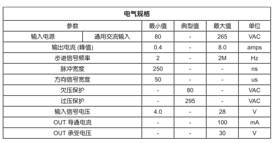 l 運行電流 - 峰值設置,撥碼開關可選,16種電流設置:0.4,0.6,0.9,1.2,1.5,2.0,2.5,3.0,3.5,4.0,4.5,5.2,5.9,6.6,7.3,8.0A